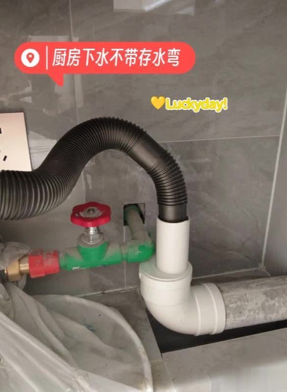 4、厨房的存水管一定要换掉,开发商自带的存水管,等装了橱柜,后期清理维修都很麻烦,即便检修口能打开,也是脏水一地,很难打理。正确的做法是改成直角弯,选择大弯顺水弯头,比直角弯头下水更通畅,安装水盆的时候再装一个下水器就可以了。
