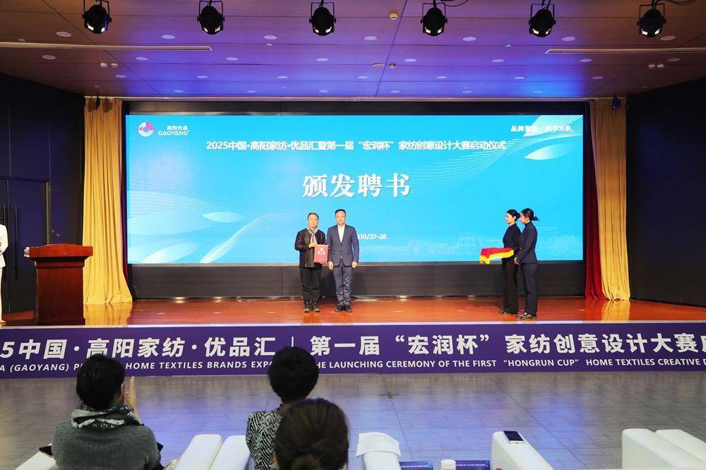 高阳家纺优品汇暨第一届“宏润杯”家纺创意设计大赛启动仪式上,颁发聘书环节。韩翠嫣摄