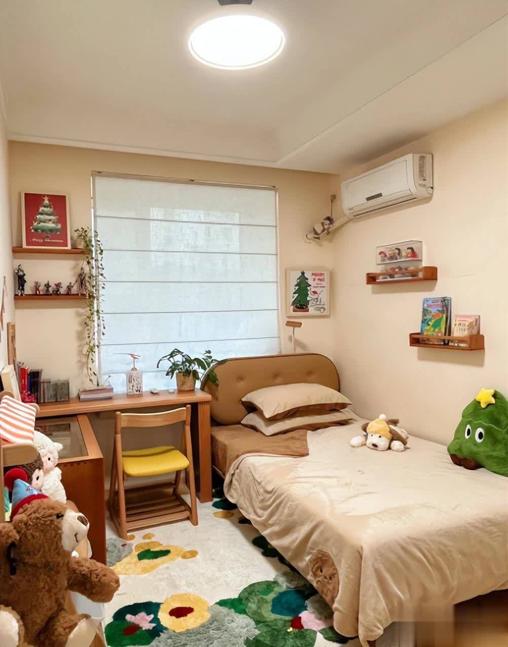 其实小卧室没有传统榻榻米,反而空间更灵活,1米2乘2m的单人床,足够陪伴孩子成长,1米1乘乘66公分的学习桌,随时可以挪动,可移动的玩具架和零食柜,空间随意变换 不被固定和定义的儿童房,跟随心境而改变。