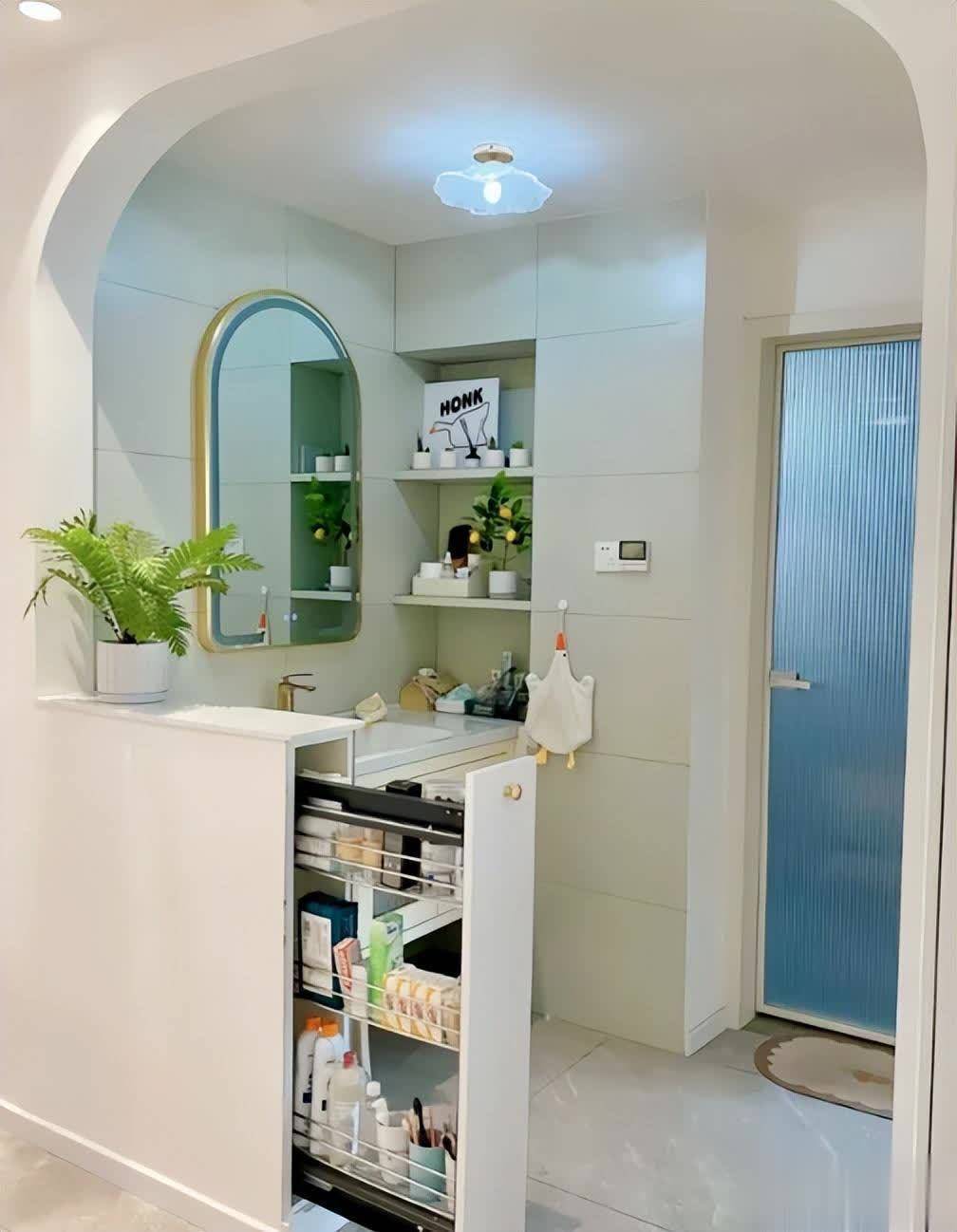 如果墙体为非承重墙,做一个拉篮窄柜,瓶瓶罐罐囤货什么的全部能收纳进去,不仅节省空间,还让卫生间更加整洁有序。不再为杂乱无章的洗漱用品发愁,轻松打造清爽干净的卫生间环境。